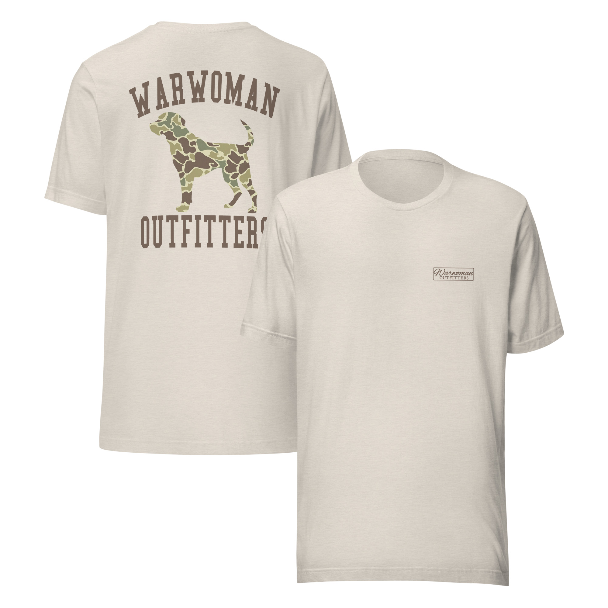 Cotton/polyester blend Dust color pre-shrunk t-shirt with full-color “Warwoman Outfitters Camo Dog” print on the back and a brown Warwoman Outfitters logo on the left chest. Imported; printed in the USA.