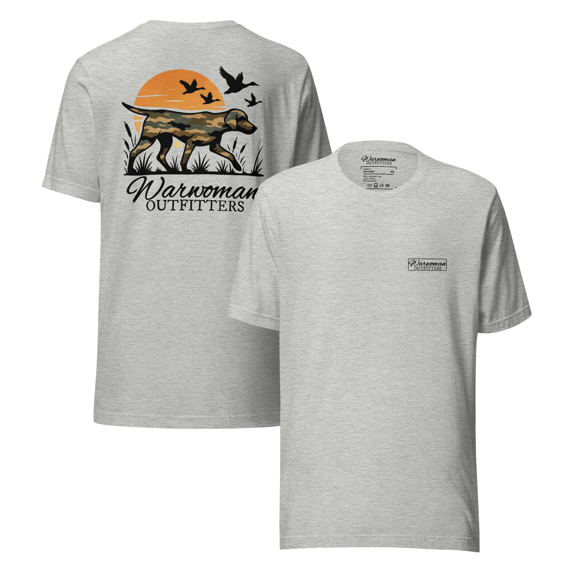 100% cotton Grey pre-shrunk t-shirt with full-color “Warwoman Outfitters Sunset Dog” detail on the back and a black Warwoman Outfitters logo on the left chest. Imported; printed in the USA.