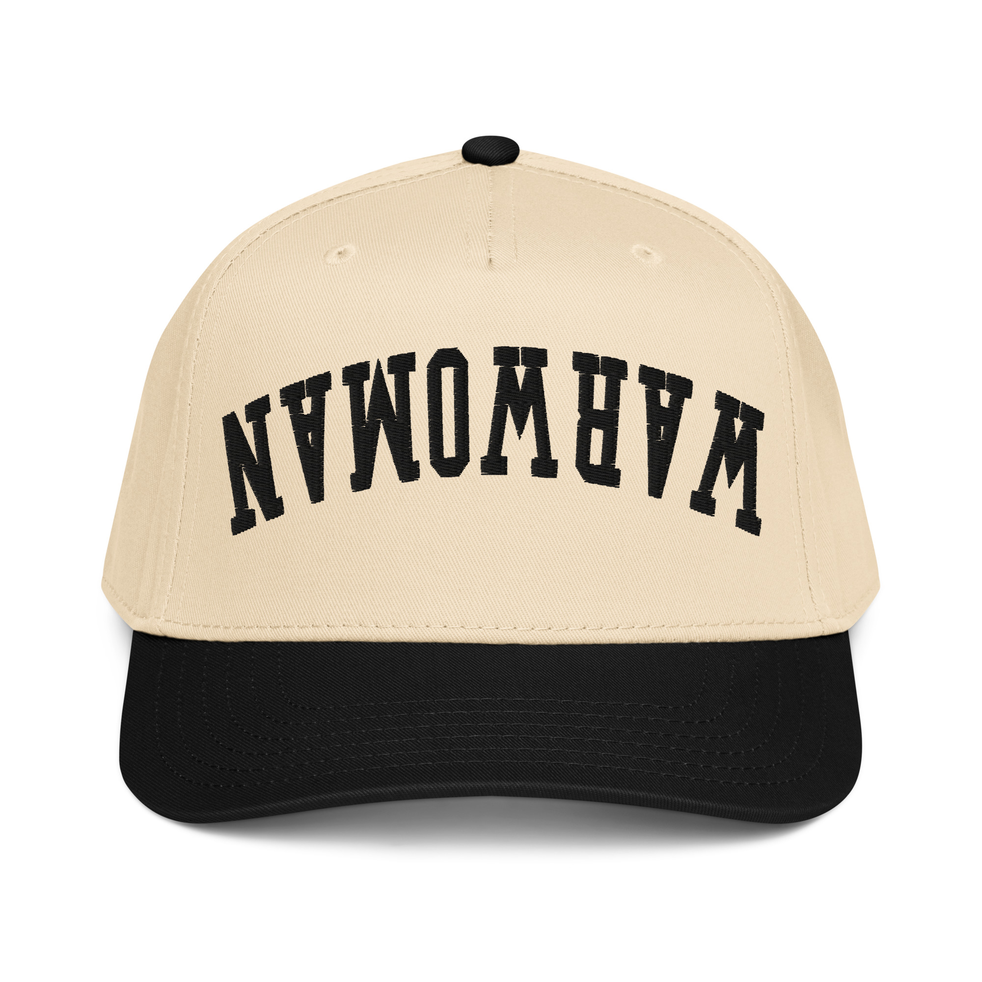 Black & natural adjustable ballcap with black upside-down 3D “WARWOMAN” puff embroidery detail on the front. Cotton/polyester blend. Imported; embroidered in the USA.