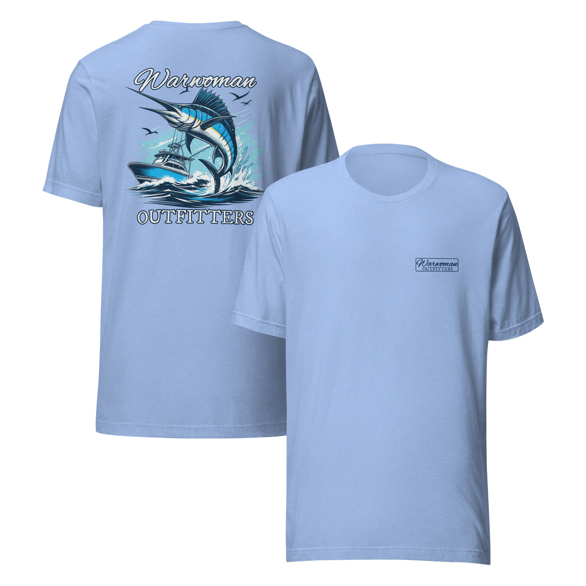 Cotton/polyester blend pre-shrunk t-shirt with full-color “Warwoman Outfitters Deep Water” print on the back and a navy blue Warwoman Outfitters logo on the left chest. Imported; printed in the USA.