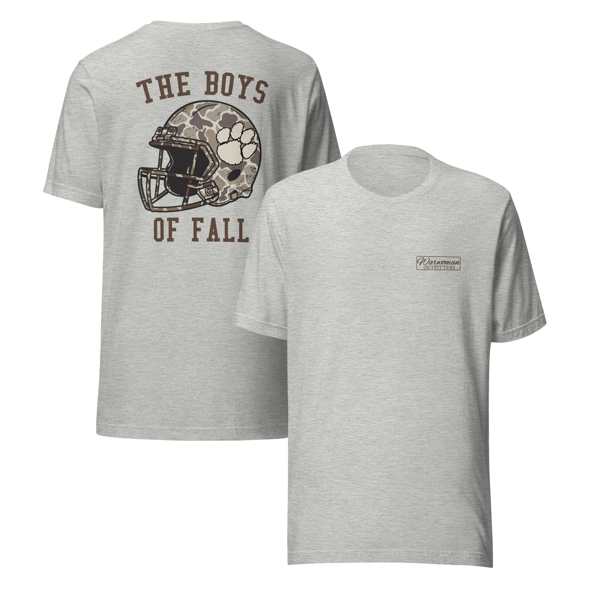 Cotton/polyester blend gray pre-shrunk t-shirt with full-color “Boys of Fall” print on the back and a brown Warwoman Outfitters logo on the left chest. Imported; printed in the USA.